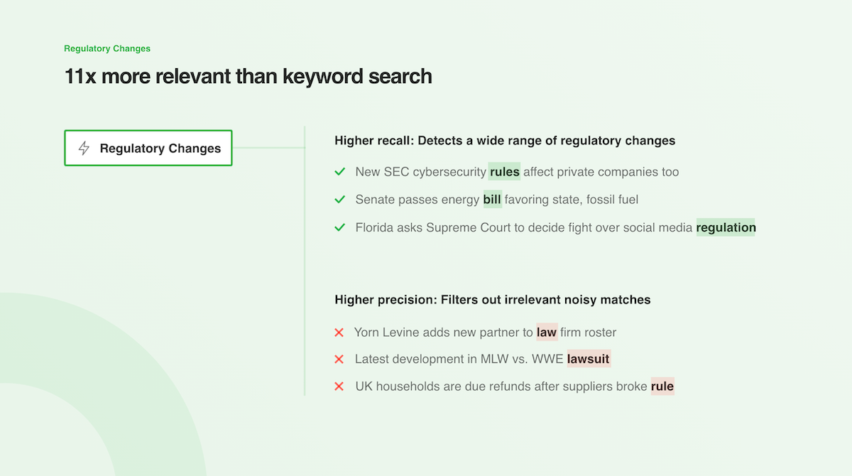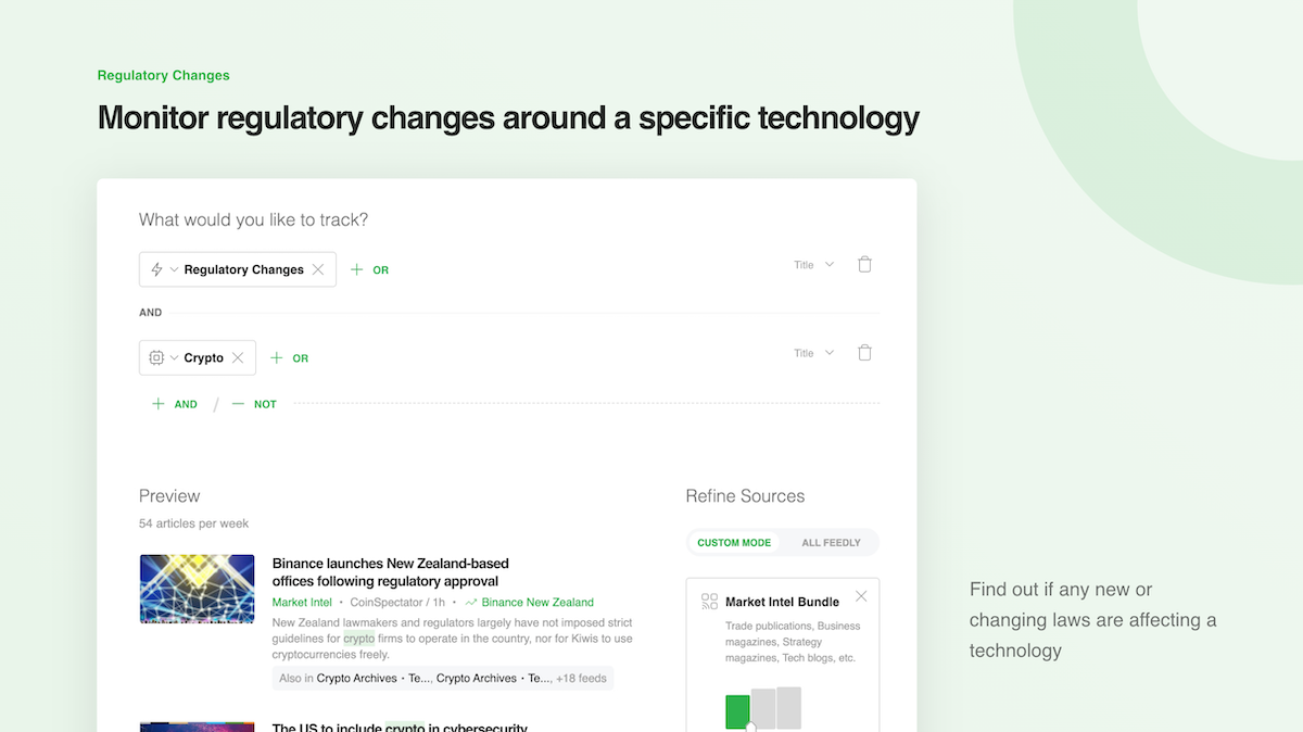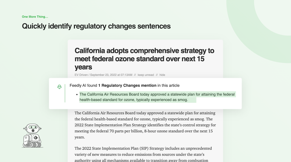 Regulatory changes is one of the machine learning models included in Feedly for Market Intelligence. Start a free 30-day trial to see how Feedly can help you speed up your market intelligence.